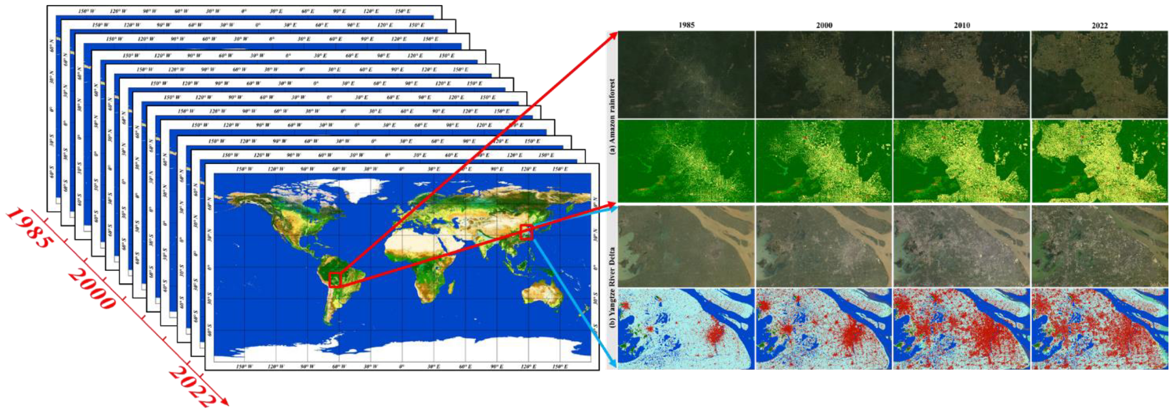 - Zhang, X., Zhao, T., Xu, H., Liu, W., Wang, J., Chen, X., & Liu, L. (2024). GLC_FCS30D: The First Global 30 m Land-Cover Dynamics Monitoring Product with a Fine Classification System for the Period from 1985 to 2022 Generated Using Dense-Time-Series Landsat Imagery and the Continuous Change-Detection Method. Earth System Science Data, 16, 1353–1381. https://doi.org/10.5194/essd-16-1353-2024