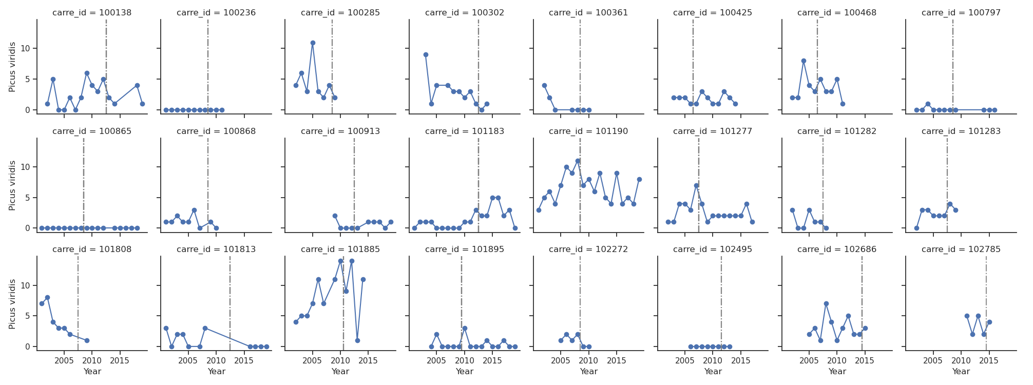 On Figure 3 we plot the monitored abundance of one common species, Picus viridis, for a selection of observation squares to give a sense of sampling effort.
