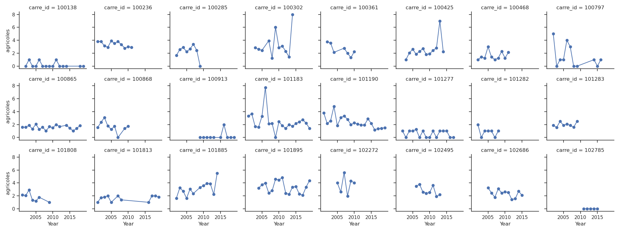 We extracted land cover data on the 2x2-km squares matching the STOC survey squares, see the example STOC squares on Figure 6. It results in short time-series as illustrated Figure 7.