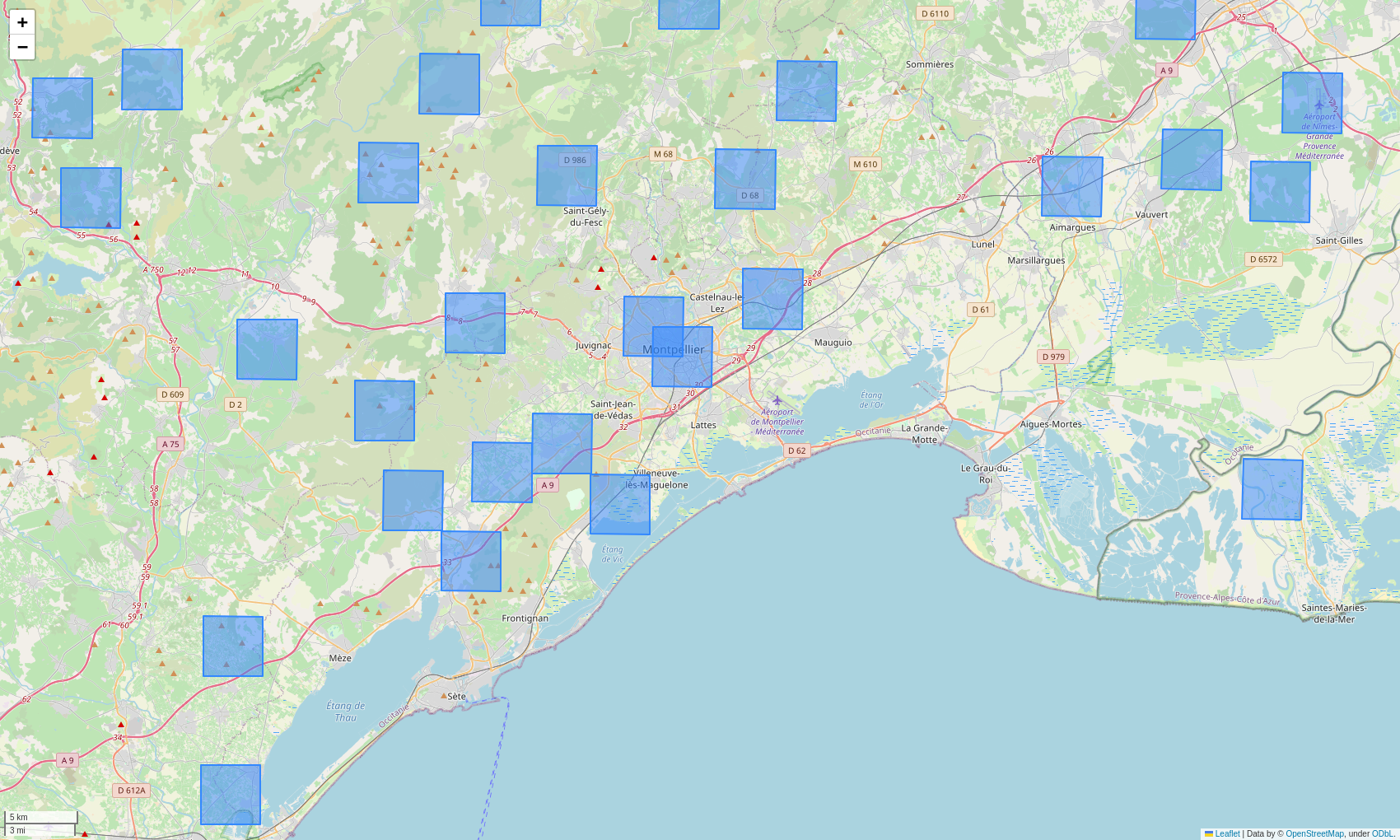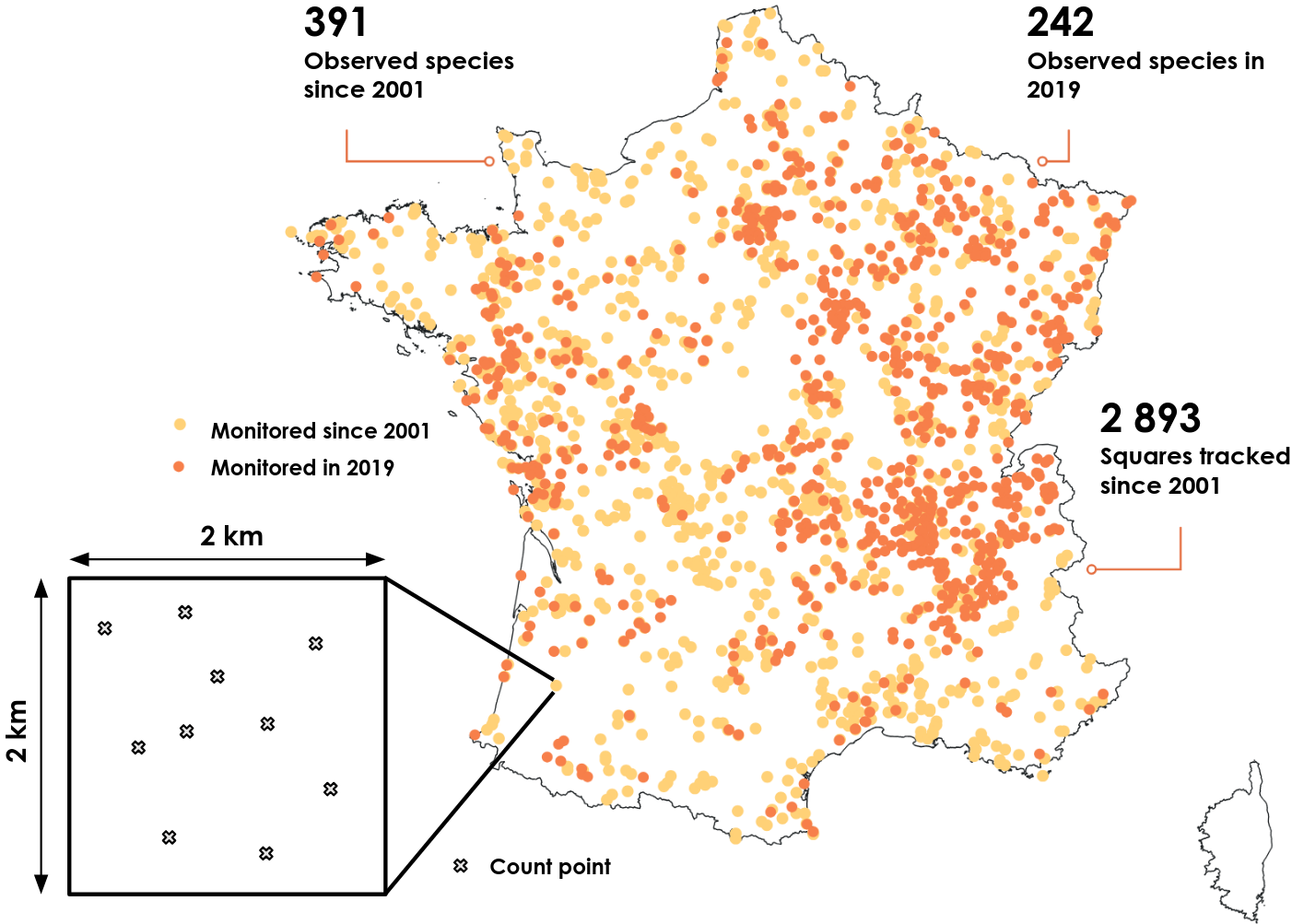 STOC is a standardized count protocol of common birds in France, with data available on the study period 2001-2019 (protocol change in 2001). Partipant observers focus on 2x2 km squares monitored according to an annual random draw, see Figure 1.