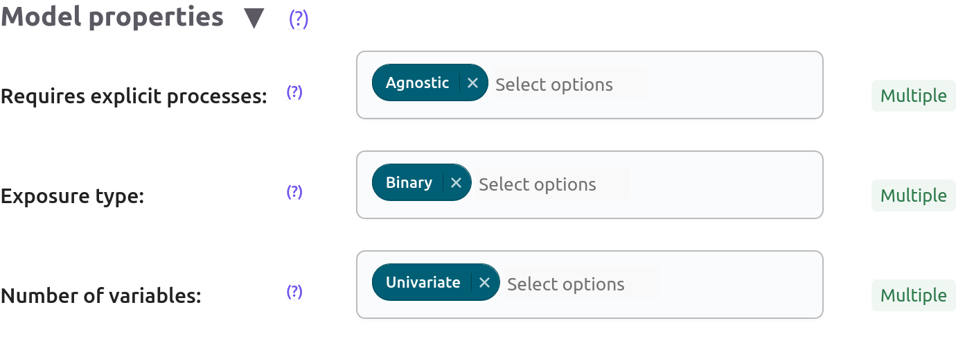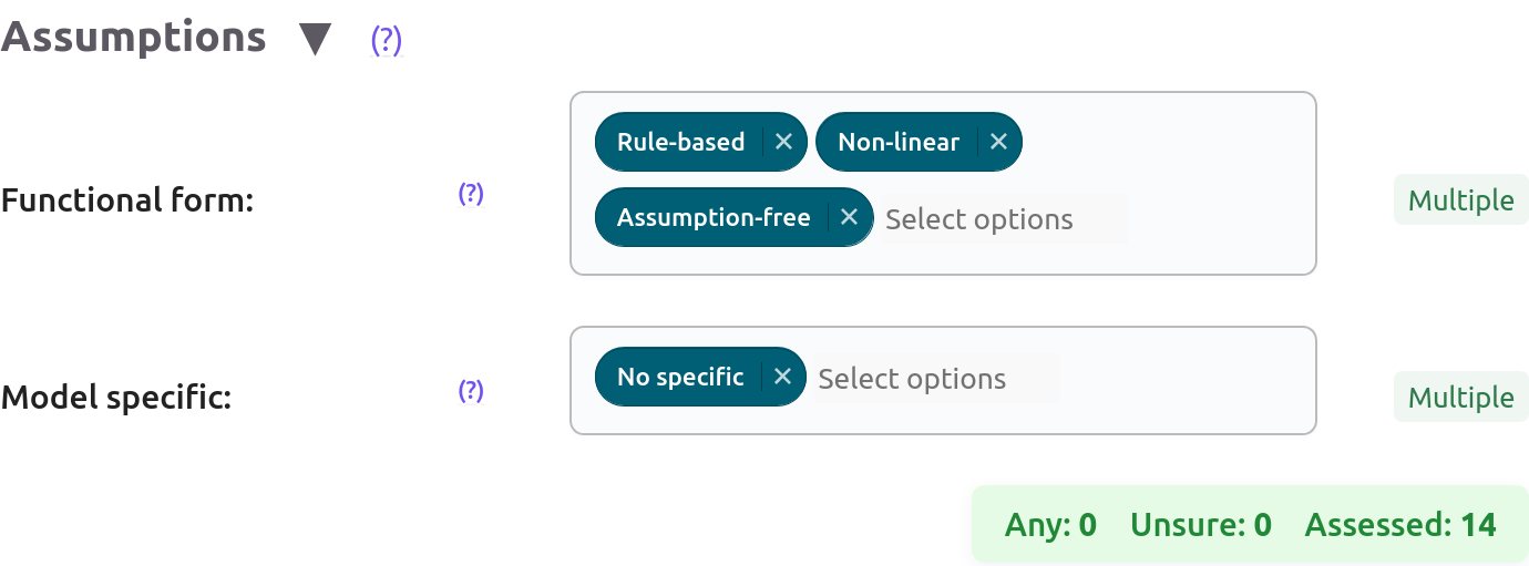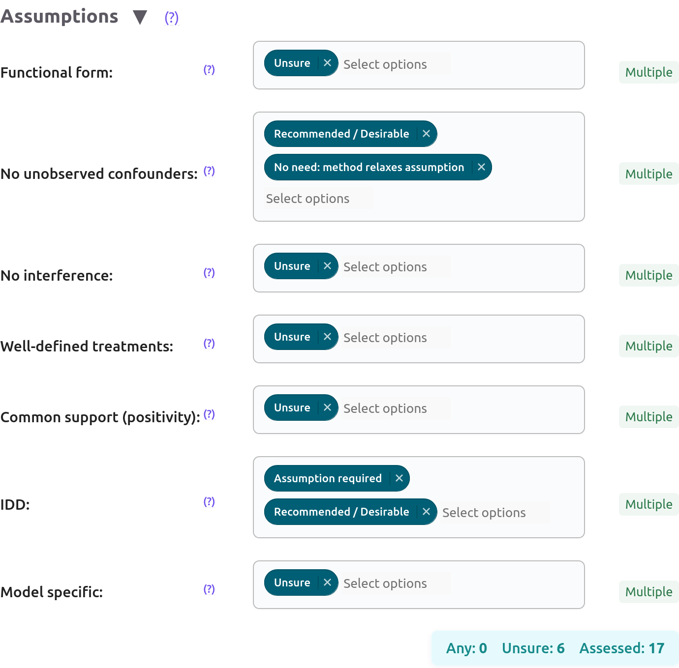 Unsure: It avoids filtering based on their options when the user does not want to emphasise an assumption. The opposite would be looking for a method that explicitly relaxes or firmly requires an assumption. Criteria withUnsureare note detailed here. - No unobserved confounders: