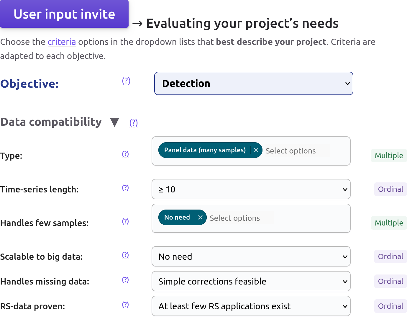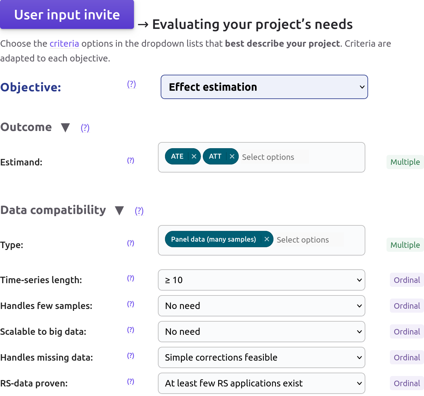 Eventually, different methods will be suggested after such an exercise, and users will then be able to consult the corresponding documentation pages and jump to the relevant resources to inform their method choice.