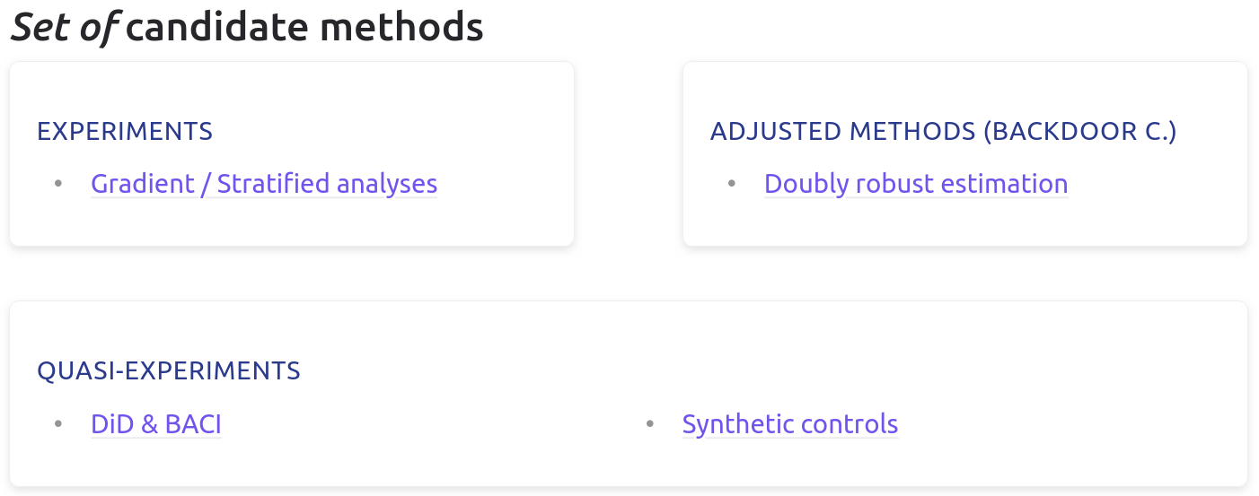 AnyorUnsureoptions, NaviDAM suggests a set of methods relying on different assumptions. This enables users to compare results across methods, assess the robustness or sensitivity of findings to assumptions, and interpret their results with multiple lines of evidence.