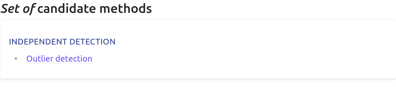 For now, only the method family Outlier detection matches the specified criteria and the page hasn’t been documented yet. To speed up NaviDAM implementation, see the contributing page. However, this case study page already illustrates how the filtering tool can be used to find candidate methods suited to your project.